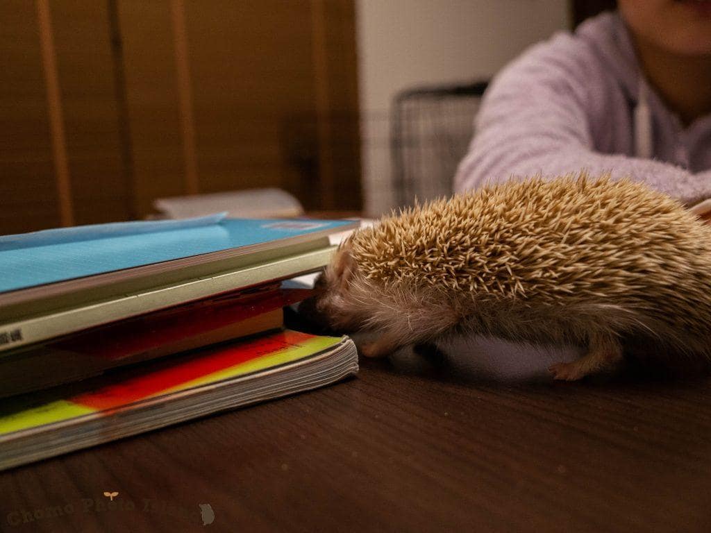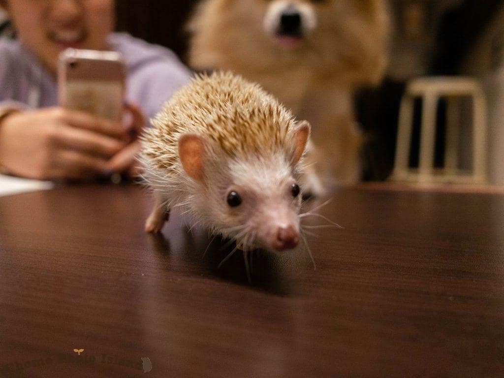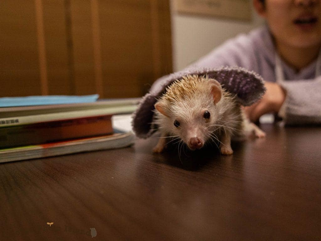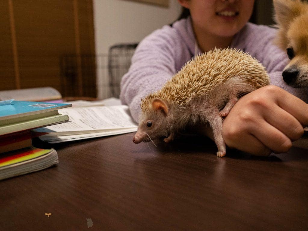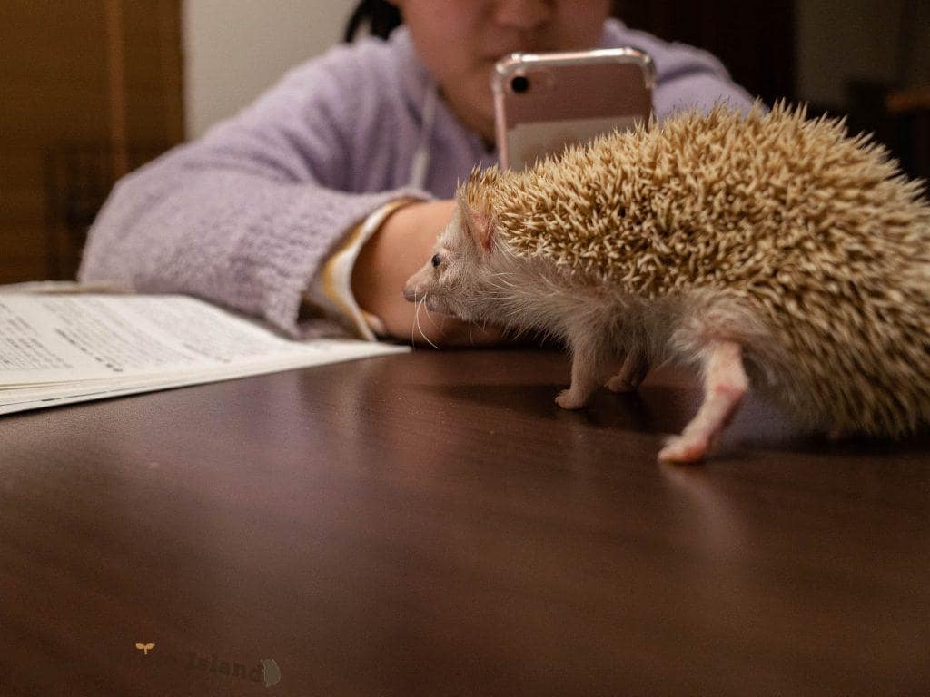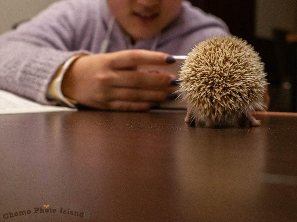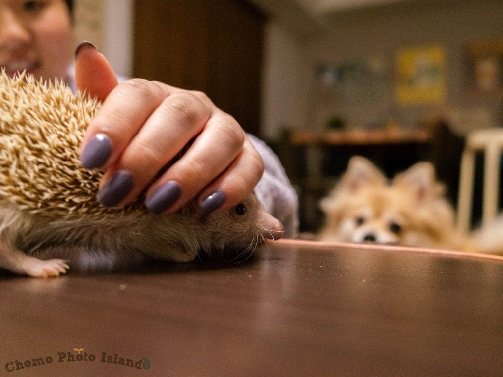なでなでタイム。人に慣れてないハリネズミは、こういった接触は苦手なのでご注意ください〜!